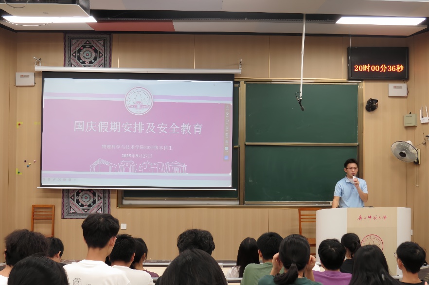 学生活动为做好国庆假期相关工作,加强安全管理与学风建设,2025年9月27日晚,物理科学与技术学院于数学楼201教室召开“国庆假期安排及安全教育”主题班会。本次会议由2024级本科生辅导员主持,2024级全体本科生参与。