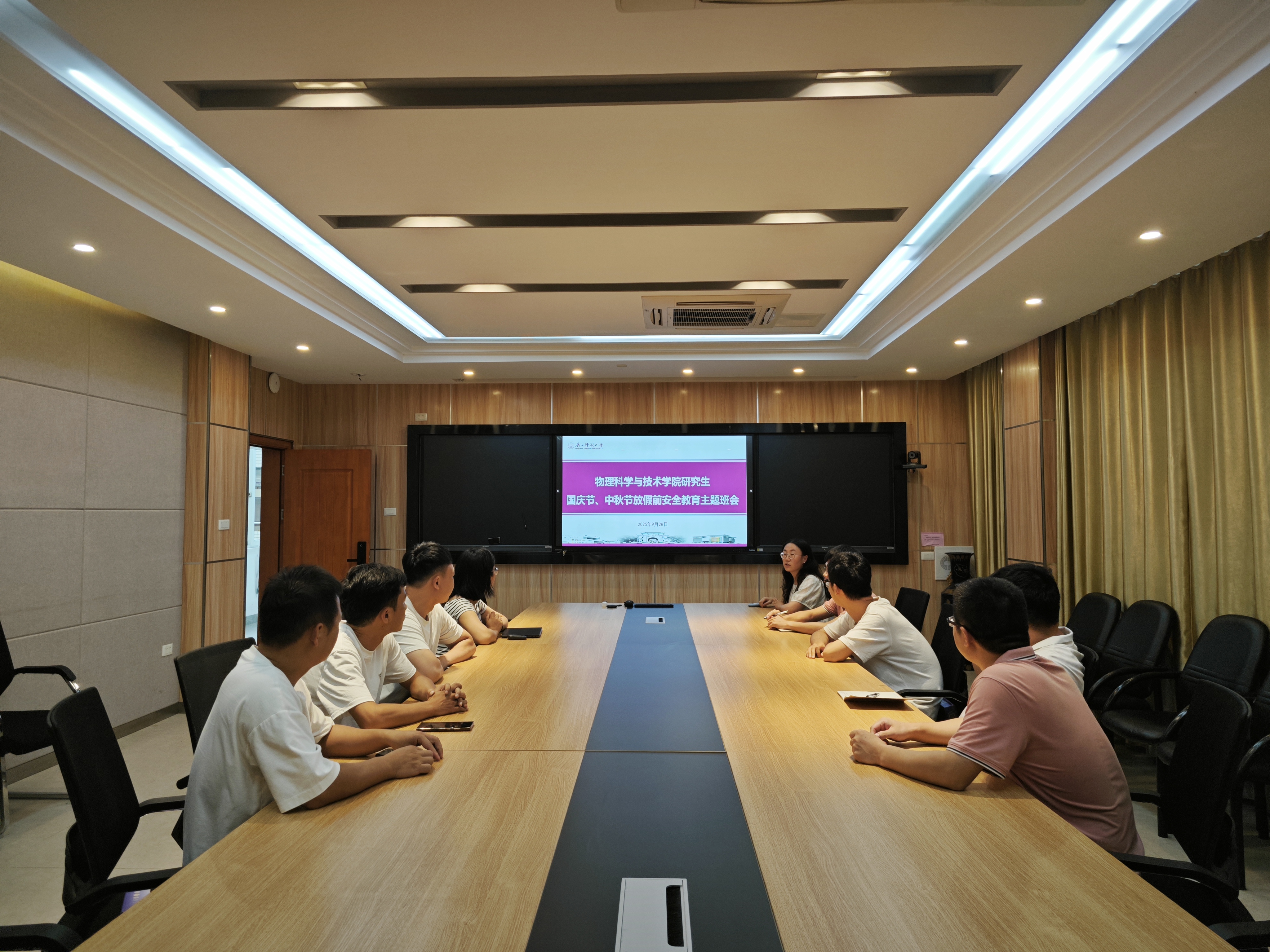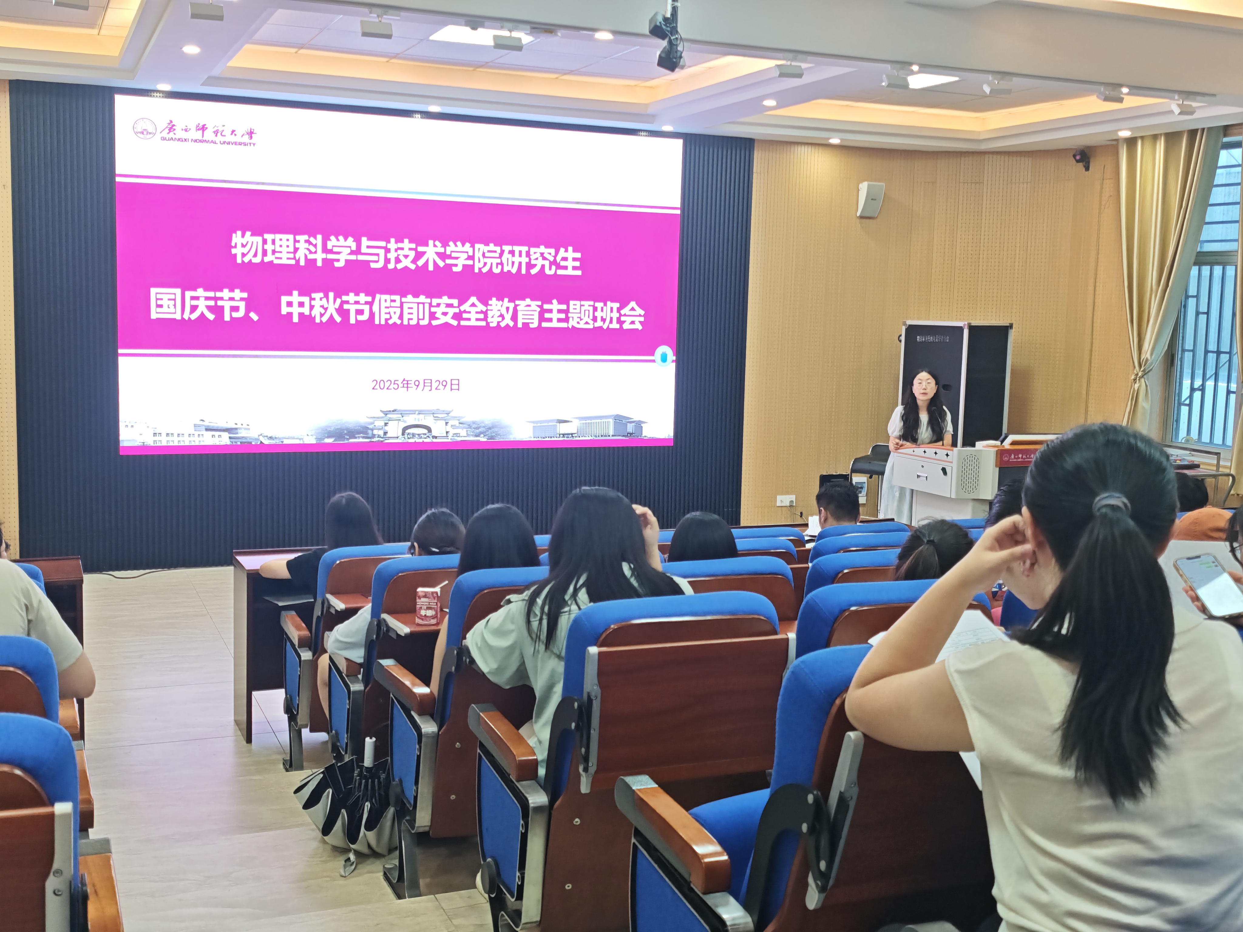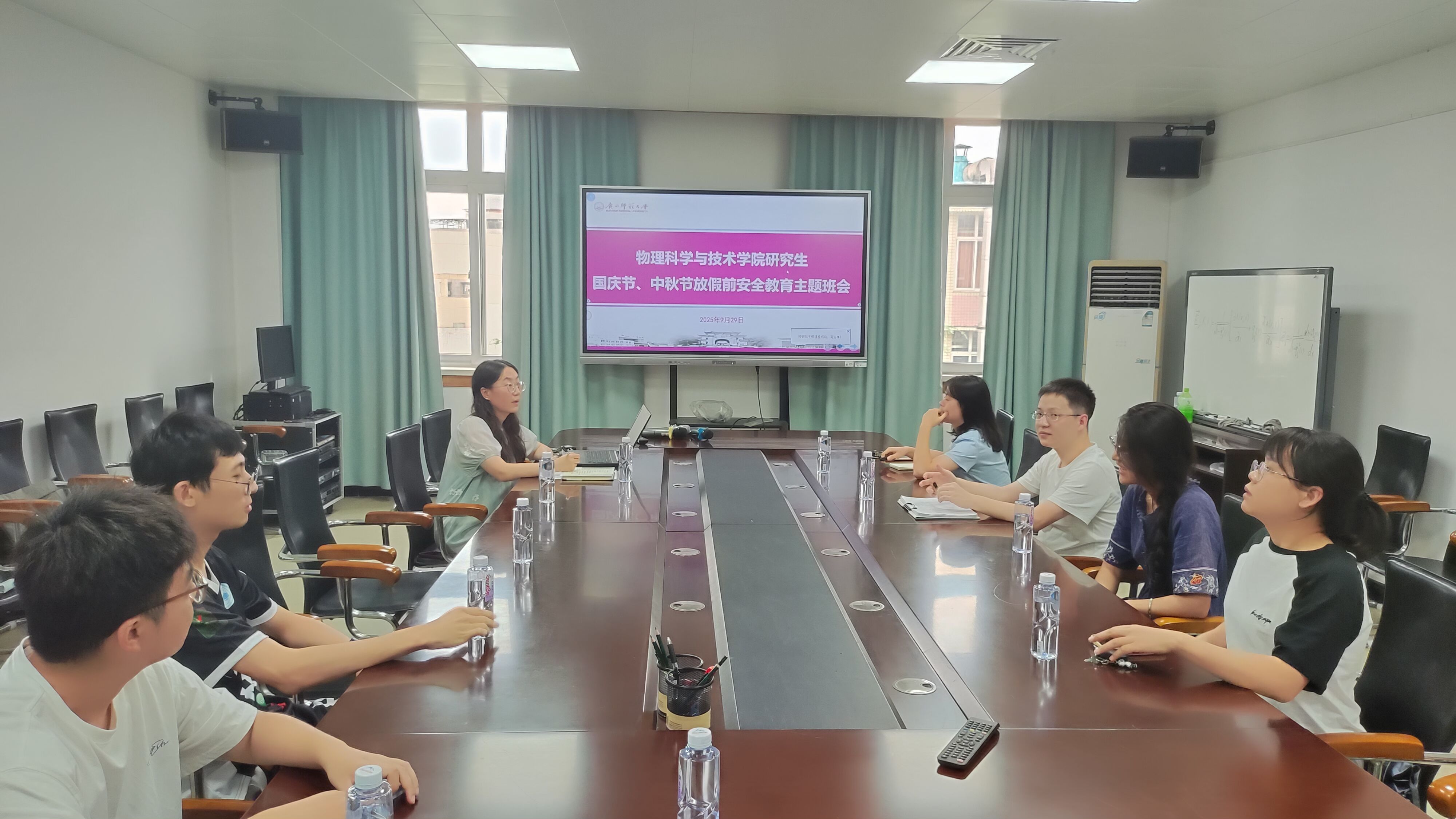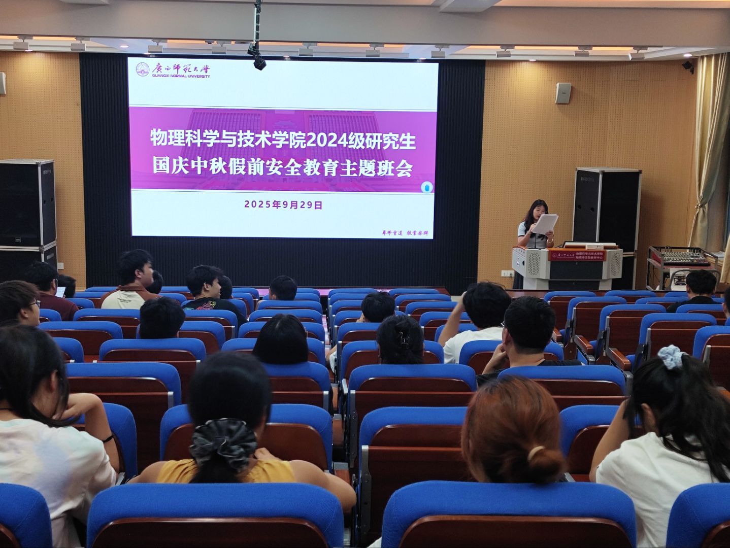 学生活动9月29日,物理科学与技术学院分别在数学楼102、实验楼阶梯教室组织召开研究生国庆假期专题班会,聚焦假期安全防护和日常管理等工作开展,为全体研究生明确假期要求与近期任务,保障各项事务有序推进。