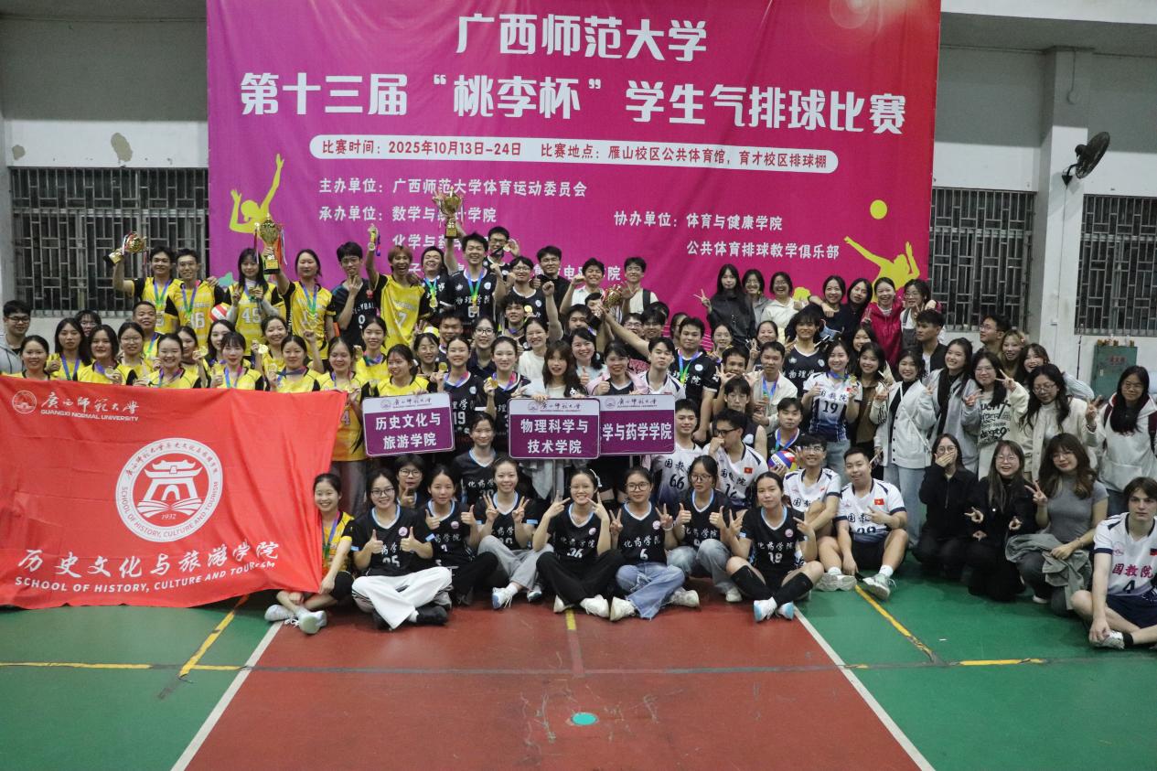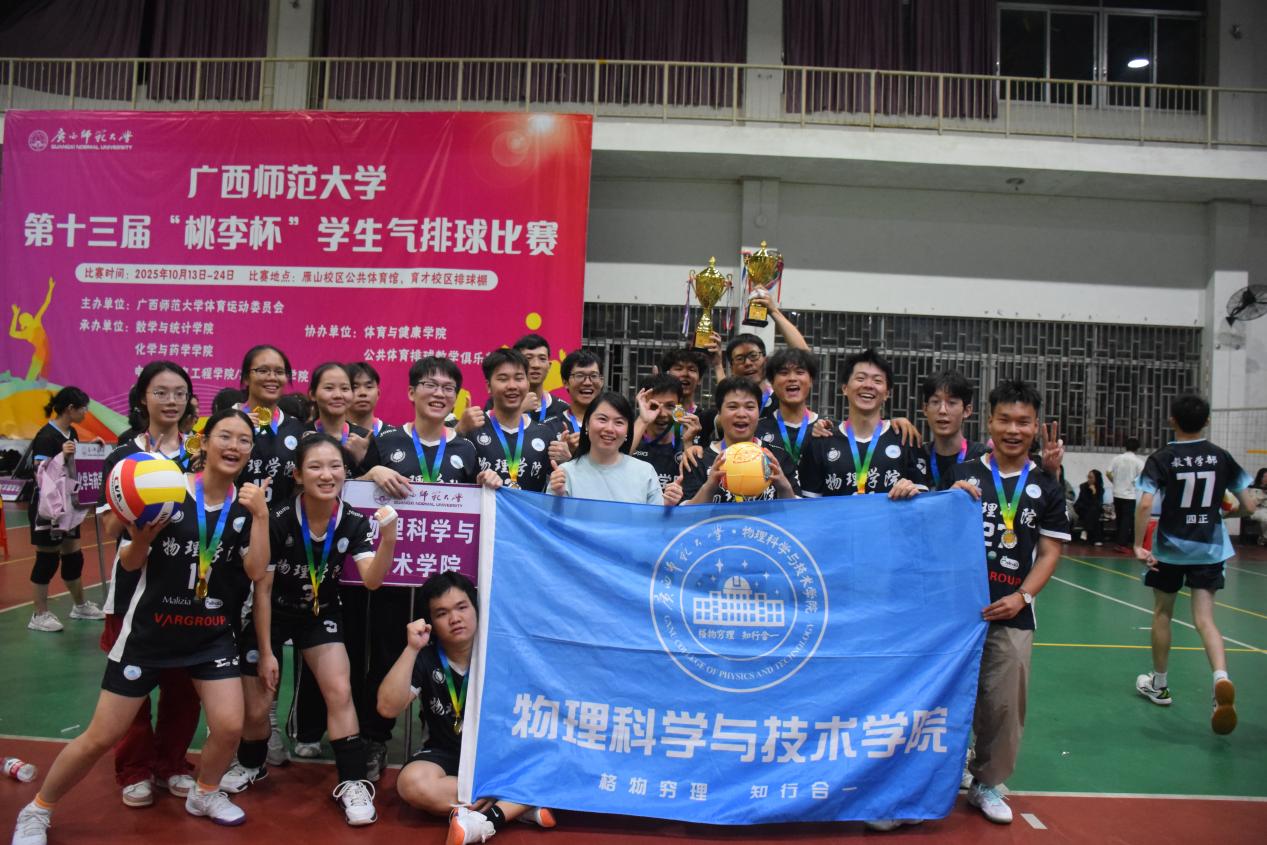 为丰富校园体育文化,增进各学院的交流互动,培养学生的团队合作意识和集体荣誉感,2025年10月24日,广西师范大学于雁山校区排球馆成功举办第十三届“桃李杯”学生气排球比赛决赛及闭幕式。物理科学与技术学院学子奋勇拼搏,表现优异。其中物院男子组荣获亚军,混合组勇夺冠军。