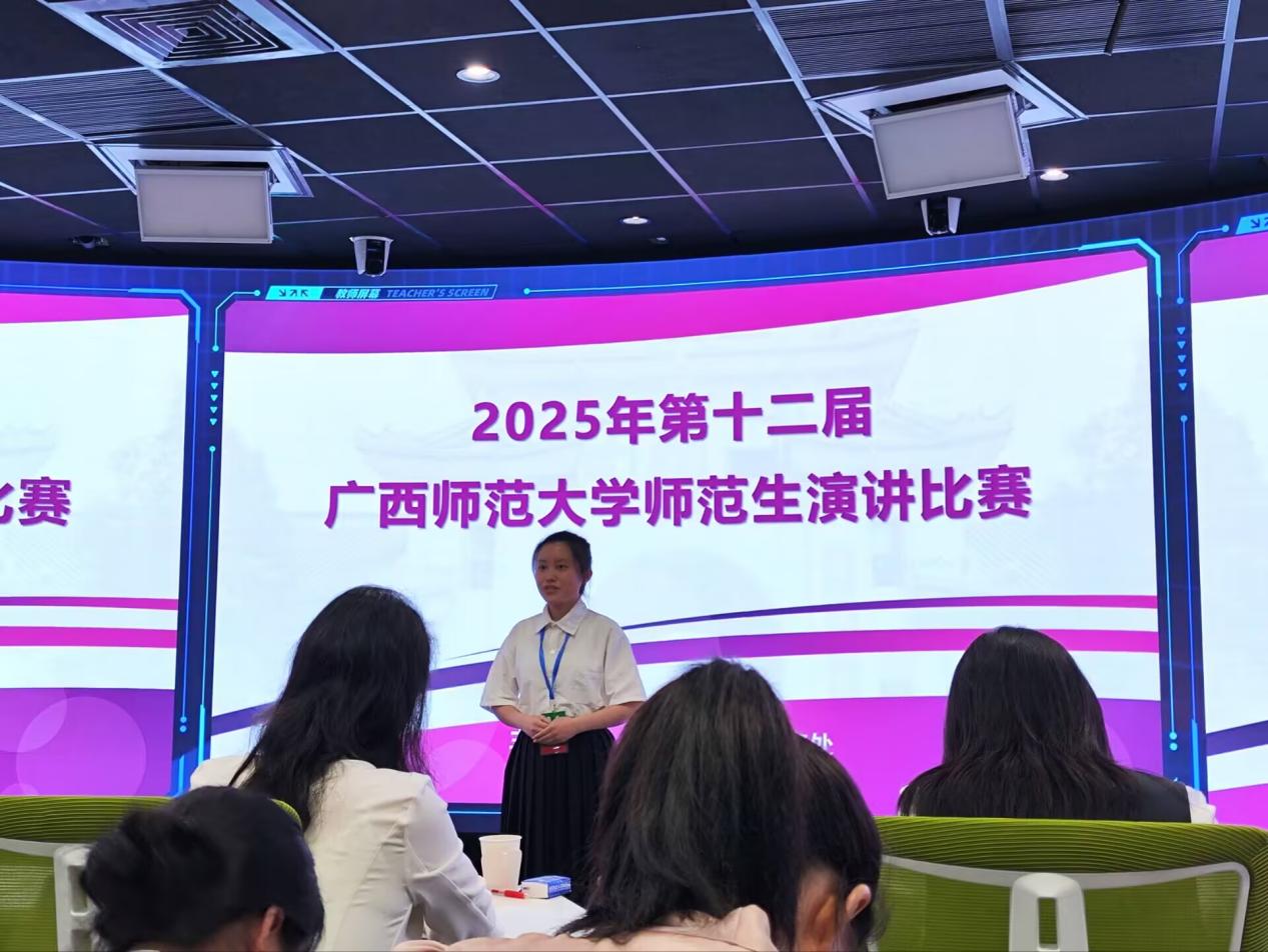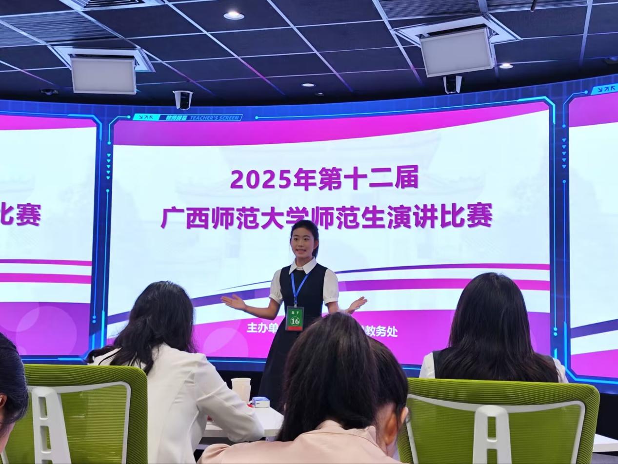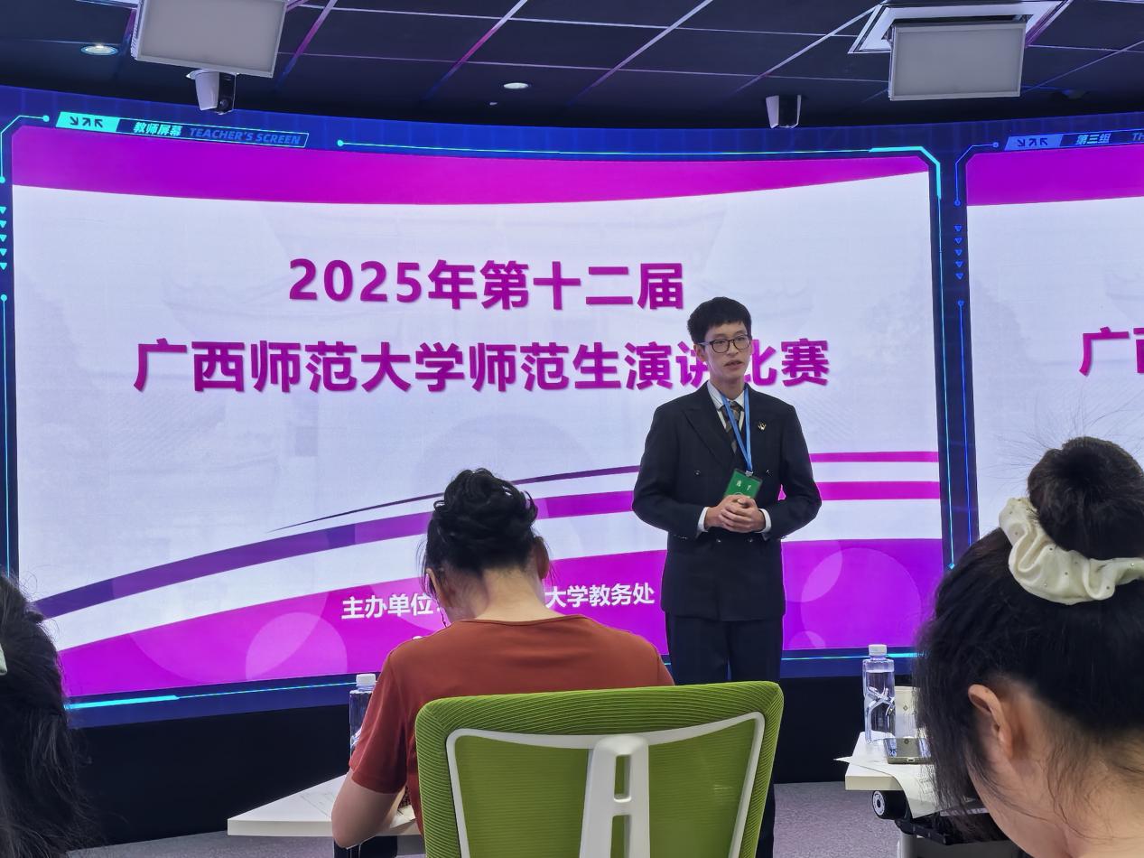 为积极响应新时代教师队伍建设号召,充分展现教育工作者以立德树人为根本的职业风采,10月18日,广西师范大学开展了2025年第十二届师范生演讲比赛。本次比赛我院共有4位选手入围,经过激烈的角逐,物理科学与技术学院陆子雄和谢昕燏同学荣获二等奖,伍楚钰同学荣获三等奖。