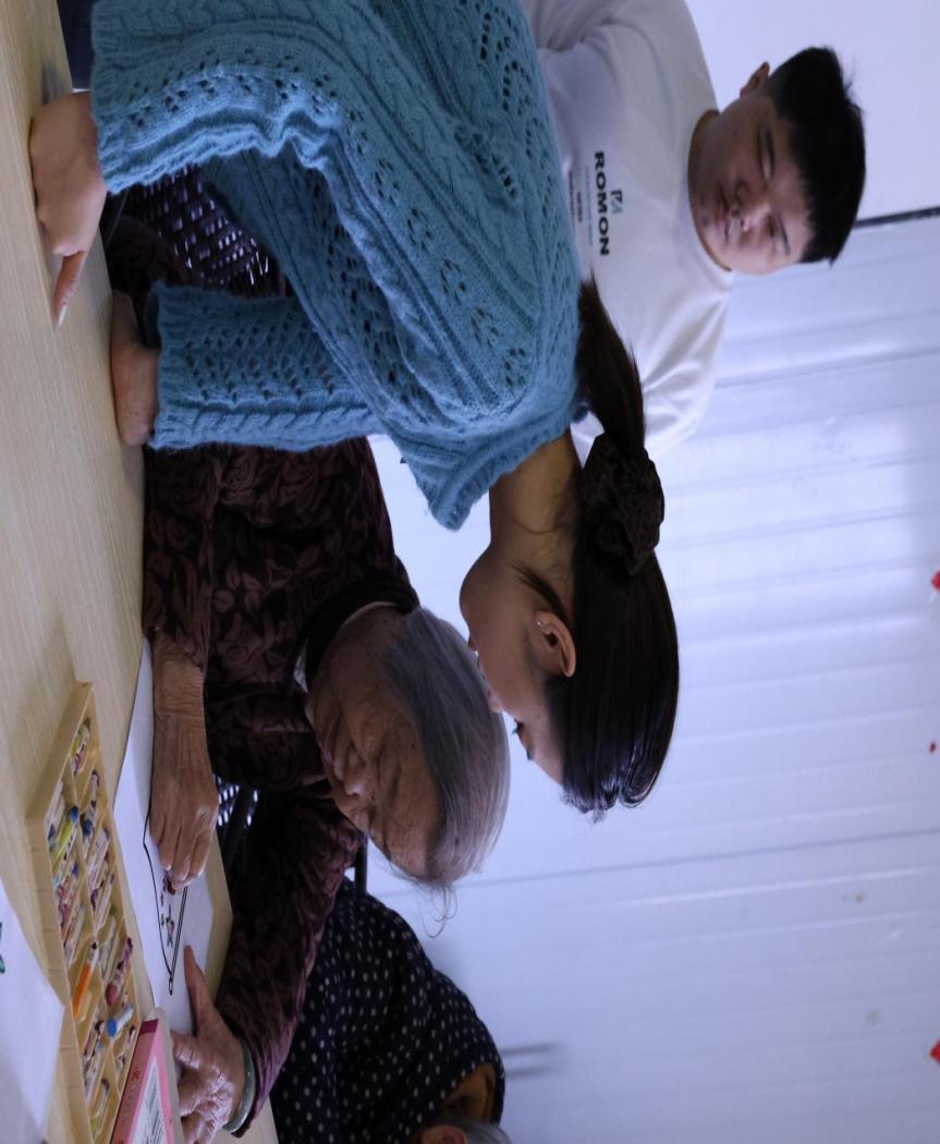 在互动环节,志愿者与老人们共同参与绘画创作。大家以“我心中的美好家园”“红色记忆”为主题,携手完成一幅幅充满情感的作品。志愿者先后献唱《强军战歌》《没有共产党就没有新中国》等红色歌曲,激昂的旋律引发全场共鸣,不少老人跟着轻声合唱。一曲《好一朵美丽的茉莉花》以柔美婉转的曲调抚慰心灵,展现刚柔并济的艺术感染力,赢得阵阵掌声。期间,他们还组织进行了党的理论知识宣讲,与老人一起阅读《习近平谈治国理政》等著作,学习习近平总书记纪念中国人民抗日战争暨世界反法西斯战争胜利80周年系列重要讲话和党的二十届四中全会精神。在交流中,红色历史与时代精神交织,进一步坚定了大家“跟党走、感党恩”的信念。