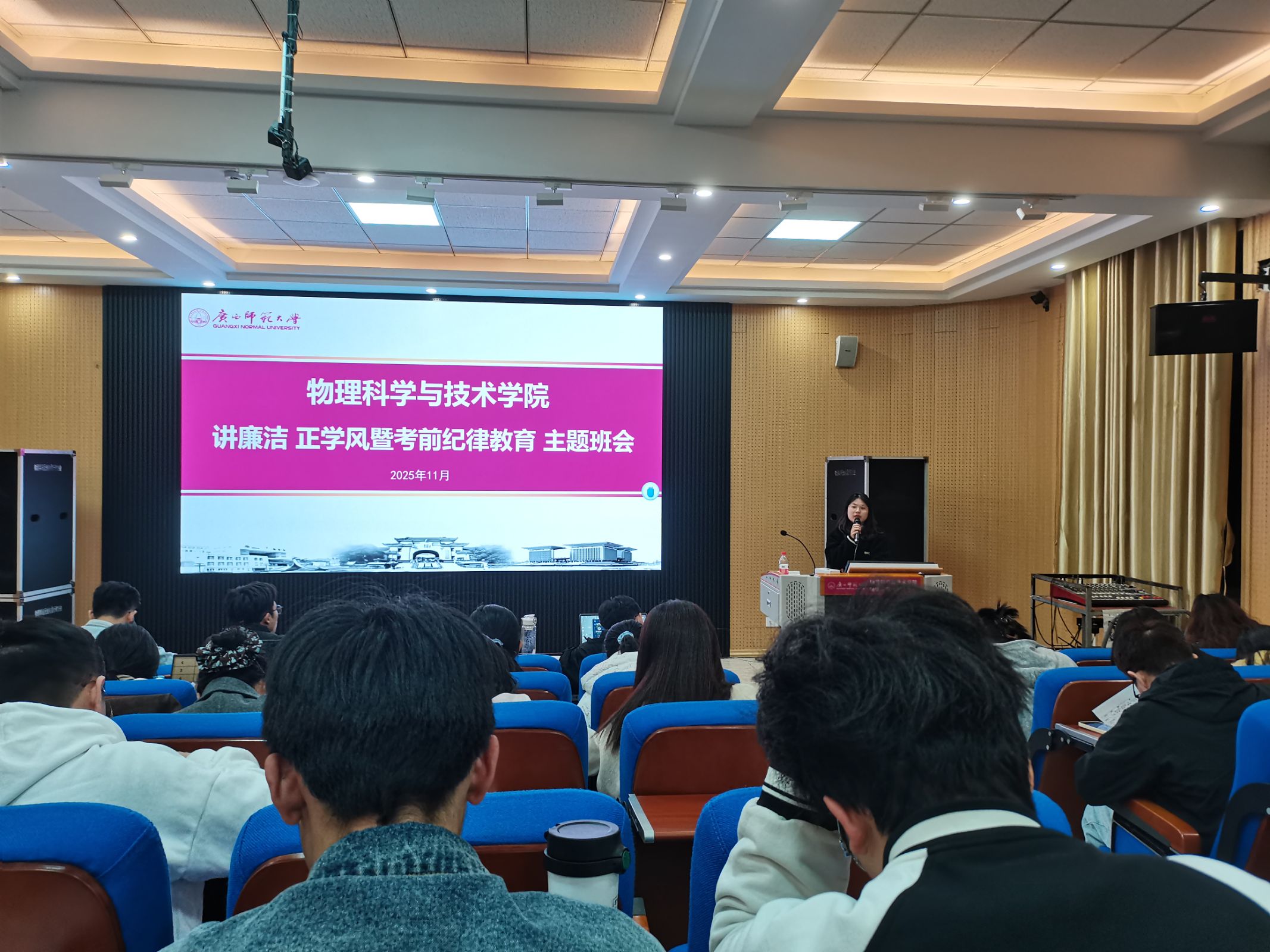 学生活动1为进一步强化考风考纪建设、涵养优良学风,2025年11月28日,物理科学与技术学院于学院楼阶梯教室召开“讲廉洁正学风暨考前纪律教育”主题会议。学院辅导员邓惠月老师及2025级全体研究生到场参会,共同筑牢学术诚信与考试纪律防线。