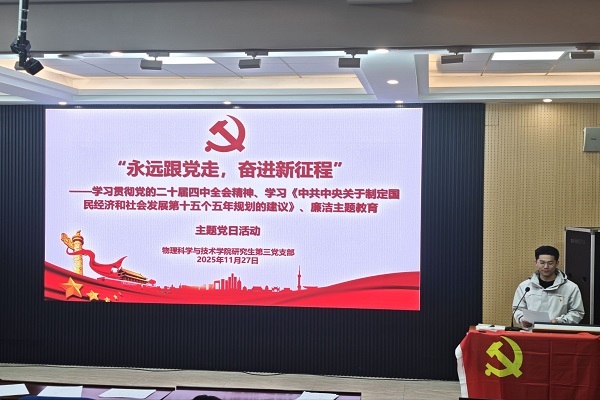党建工作2025年11月27日,物理科学与技术学院研究生第三党支部在物理实验楼阶梯教室开展“永远跟党走,奋进新征程”主题党日活动,将理论学习与组织建设深度融合,凝聚支部奋进力量。