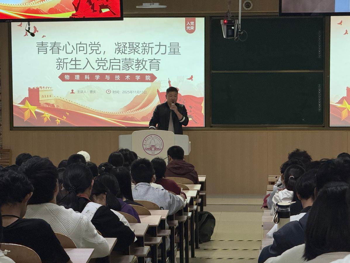 学生活动2为引导新生积极向党组织靠拢,端正入党动机,夯实党员发展基础,11月13日,物理科学与技术学院在第二文科综合楼0110教室开展2025级新生入党启蒙教育。本次讲座由学院党委副书记曹庆老师主讲,2025级本科新生参加。