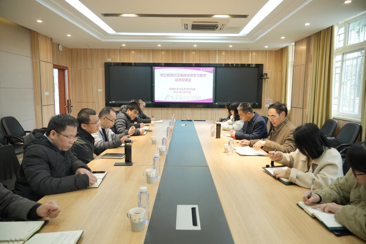 学院新闻3月10日上午,物理科学与技术学院党委在学院105会议室召开动员部署会,传达学习学校党委相关会议精神,启动树立和践行正确政绩观学习教育工作。学院党委书记主持并作动员部署,党委委员、领导班子、师生党支部书记参会。