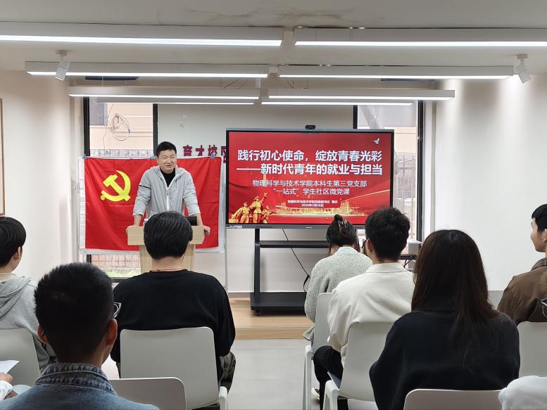党建工作1为引导青年党员树立正确就业观,3月26日,物理科学与技术学院本科生第三党支部在“一站式”学生社区思政家园开展微党课活动,本次微党课以“践行初心使命,绽放青春光彩——新时代青年的就业与担当”为主题,学院党委相关负责人受邀为支部党员讲授专题党课。