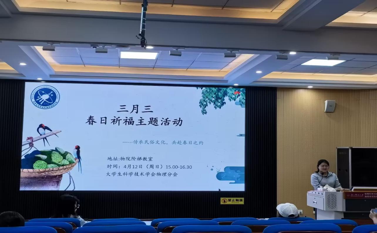 学生活动22026年4月12日下午,物理科学与技术学院大学生科学技术协会物理分会在物理实验楼阶梯教室成功举办了“传承三月三文化,绣球手中绽芳华”主题活动。此次活动旨在弘扬壮族传统节日“三月三”的文化内涵,增强大学生的文化自信心和民族自豪感,活动由科协会长部成员主持。